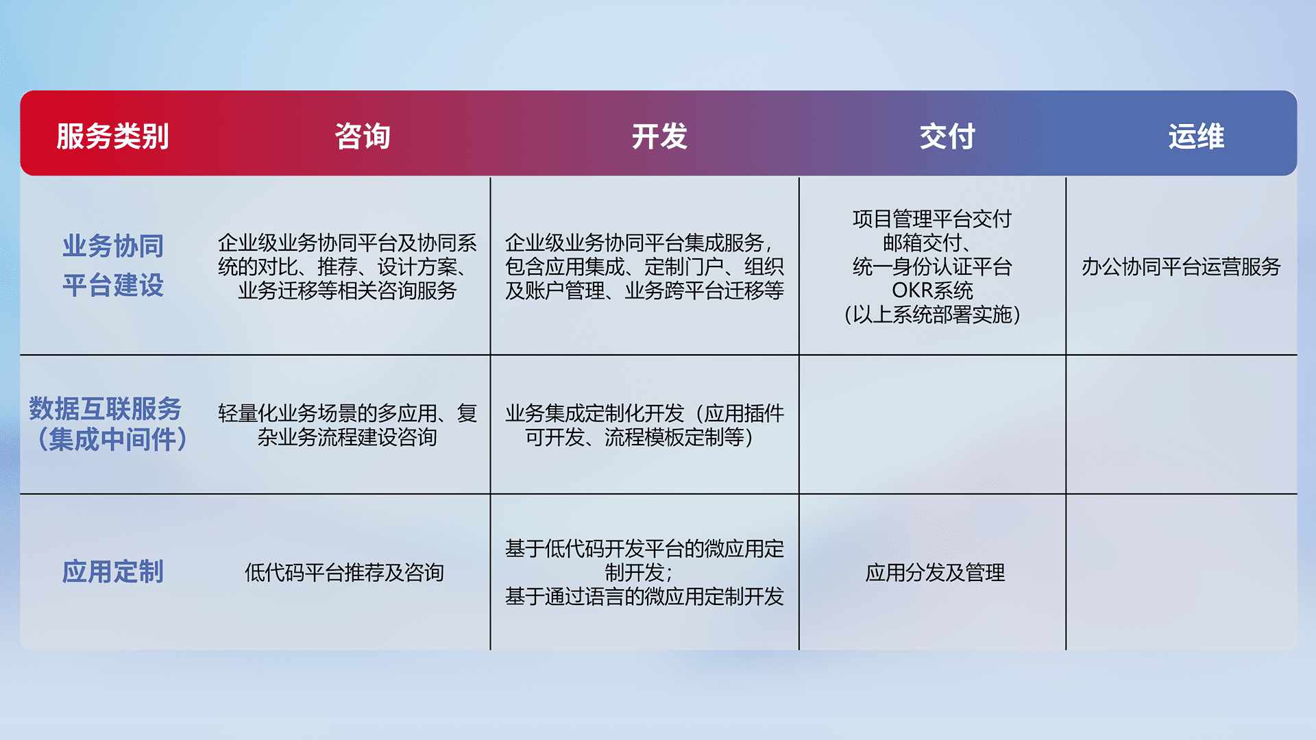 针对钉钉、、、、企微、、IDaas等平台级产品提供产品的规划、、、、方案、、、交付、、、、定制化开发等服务,,实现如统一协同办公、、、、智能客户服务、、、混合会议管理、、、智能数据查询、、、等业务场景,,,实现数字化转型。。。